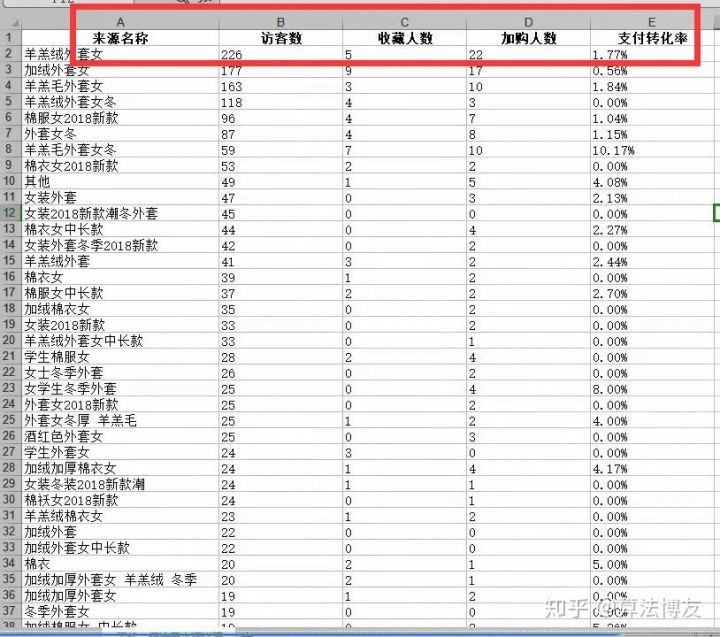• 通过关键词效果分析进行标题优化(入口:卖家中心-生意参谋-商品-单品分析-来源去向-关键词效果分析)。单品链接关键词分析首先关键词数据下载,然后统计7天数据,找到无法提升的和下滑的关键词:参考两个数据,访客数和支付转化率。