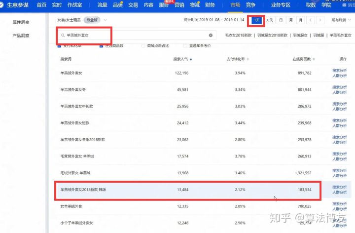 3、访客数从高到低排序,找出引流最多的关键词,“羊羔绒外套女”’, 通过市场洞察搜索该关键词,看一下这个关键词下的延伸词,有没有带空格的词各项数据比较好的能为我们所用