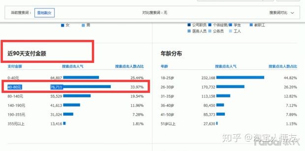 那么数据显示40-80是市场支付金额占比最高的,也就是这个类目低价会更受欢迎,群体是18-25岁、高价产品是355元,根据自己的产品的情况去出适合的定价。