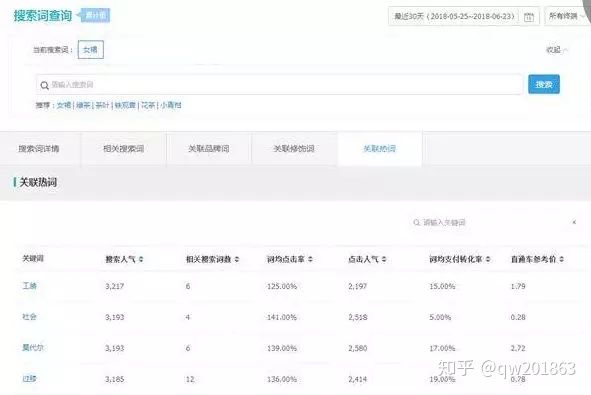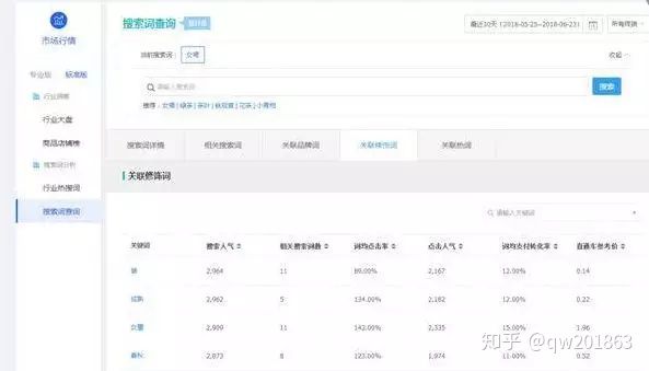 通过数据分析不难看出女裙的搜索人气太大,在新店初期肯定是很难获得展现,所以我们在做标题的时候,要保持我们标题初期的核心产品词搜索人气不要太大 。如果过大就添加属性词去降低热度 。通过分析生意参谋中的关键热词,关联修饰词,将女裙加入相应的属性词来降低核心词的热度。