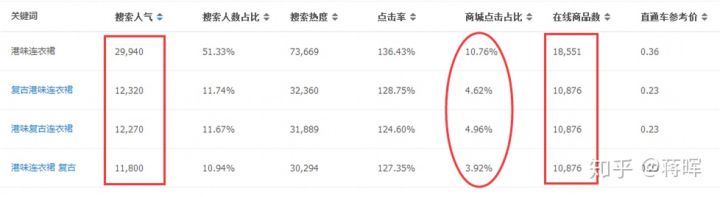 我们用每天的搜索人气比上在线商品数量来得到这样一个比值。这个比值肯定是越大越好,越大代表这个市场相对容易做,如果越小相对来讲就是这个产品竞争起来会难。搜索人气就代表这个商品有多少人需求去搜索,而在线商品数量就代表这个市场上有多少人已经在卖这个产品,所以我们用这个数值代表这个关键词它下面的市场做起来的难易程度。