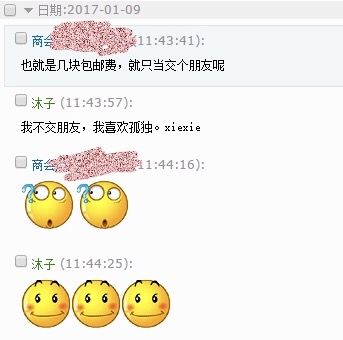 图中聊天记录里的妹子让我包邮,但宝宝是有原则的人。一般不给包邮的(其实也不是,看心情,有不错的妹子我还是会给包邮的。哈哈)当她说:包邮吧,就当交个朋友吧!宝宝就下定了决定:不包