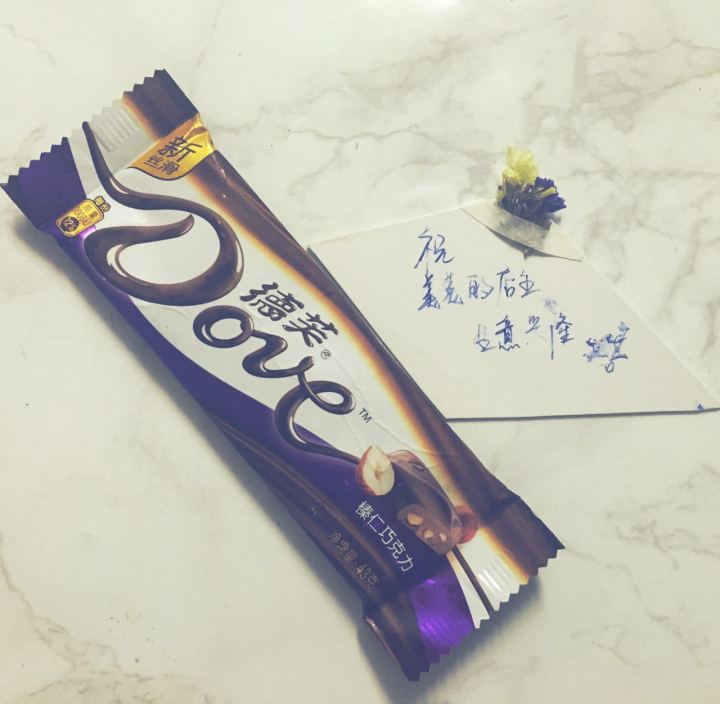 有一次我收到一个妹子的退件,惊奇地发现里面竟然有一块德芙巧克力!还有一写了字的小卡片,上面还附有我送给顾客的小花!超级用心!