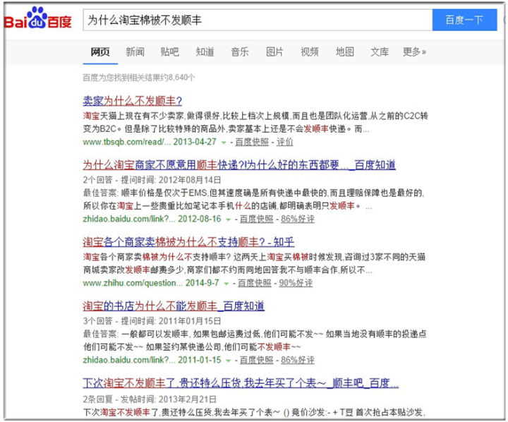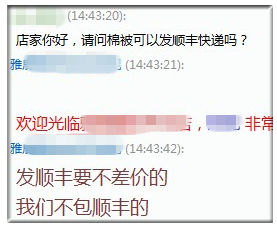 为满足好奇心,我先就此问题进行百度。在将“淘宝”、“顺丰”、“不发顺丰”、“为什么”、“棉被”等这几个关键词进行各种不同排列组合的搜索后,没发现多少就这个问题发生的讨论。