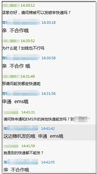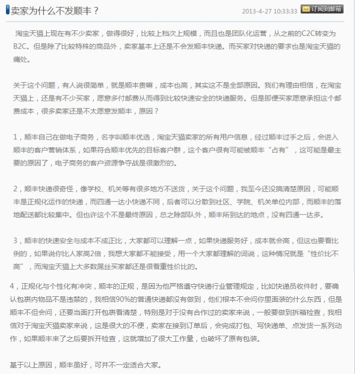 3.据已知情况推测,不愿意发顺丰的天猫店仅仅是因为与顺丰快递无合作关系而已。不合作的原因通常是已与另外一两家快递公司签约以取得更为低廉的快递价格,这在淘宝卖家中是很常见的现象。