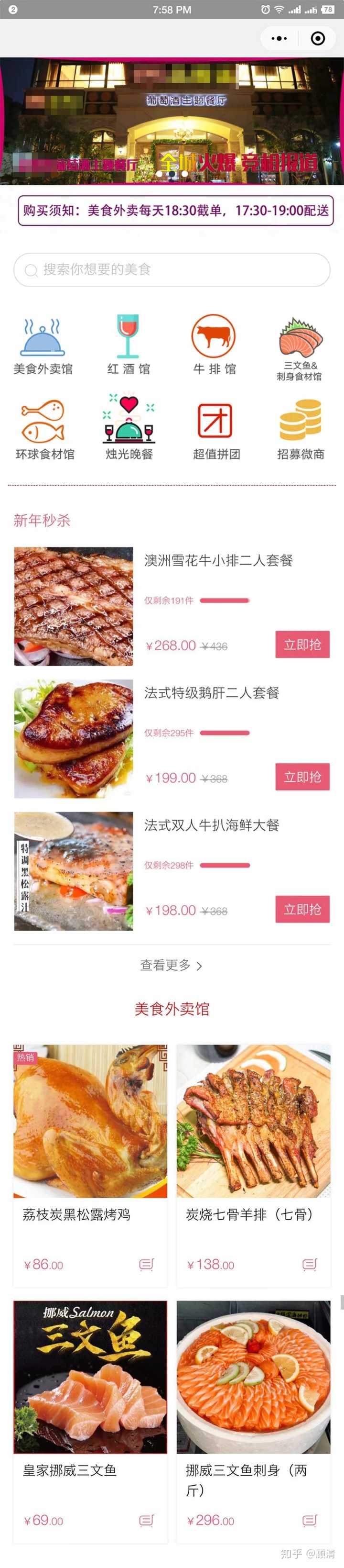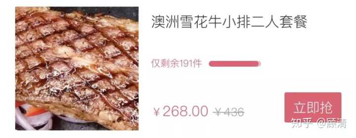 3、秒杀做法:秒杀主要针对“非情侣客户”,购买后2人到店食用,达到“老带新”目的。例如“原价436元,限时秒杀268元的「澳洲雪花牛小排二人套餐」”,如图。秒杀效果显著的主要原因还是西餐是高溢价产品,动辄5折促销具有吸引力。