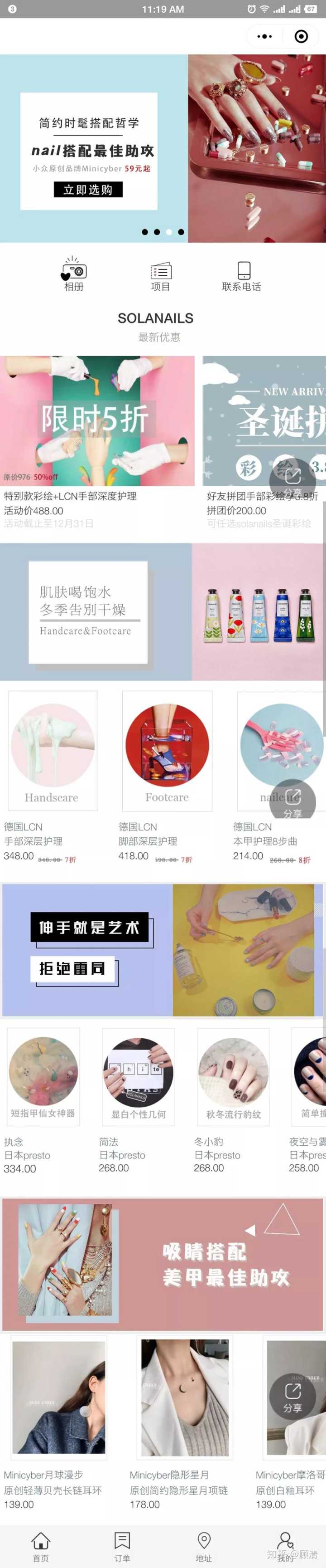 「XX美甲王小程序商城」主要功能:商城直销、积分体系、营销活动(拼团、计次卡优惠、储值优惠),商城装修风格青春唯美、少女味爆棚。