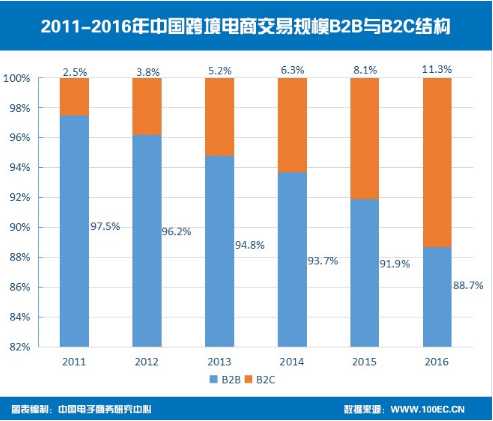 看一下跨境电商每年市场份额的增长速度,然后再看一下B2C模式的增长速度。