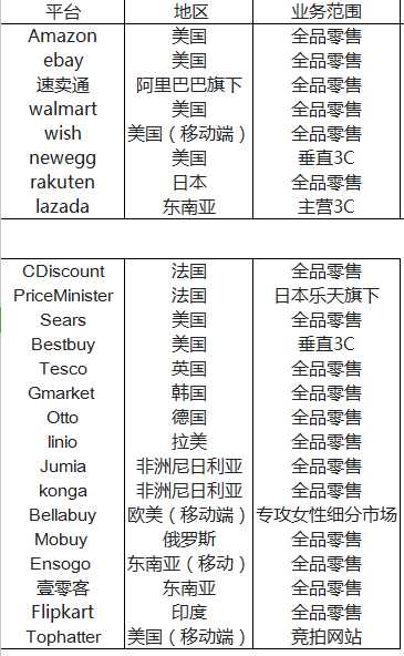 Amazon、wish、速卖通、ebay、lazada、Newegg、rakuten、Walmart、CDiscount、PriceMinister、Sears、Bestbuy、Tesco、Otto、Gmarket 、linio、Jumia、konga、Bellabuy、Mobuy、Ensogo、壹零客、Flipkart、Tophatter