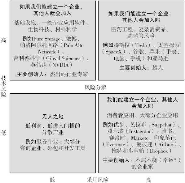 右上角的象限代表高科技风险和高采用风险共存的企业,如具有强大吸引力的苹果、特斯拉、谷歌和皮克斯(Pixar)等公司。它们的创始人往往既是杰出的专家,也是每日全天无休的营销机器。代表人物包括乔布斯、沃兹尼亚克(Wozniak)、埃伦(Elon)、谢尔盖(Sergey)和拉里。这些消费类公司的成功取决于出色的技术执行、消费者满意度和用户采用度。