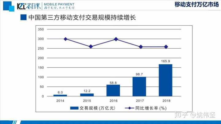 移动支付2018年交易规模达到165万亿,每年递增,未来会全面落实使用移动支付,现金淘汰,作为移动支付生态下不可缺少的一环聚合支付爆发,更能满足消费者付款多样化的需求。