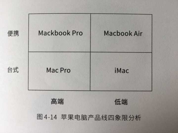 这个方法通常用于战略制定中,比如乔布斯在1996年重掌苹果时,就用这个方法确定了公司的产品方向。他从专业维度和便携维度这两个属性来考虑,把电脑这个产品分成4个类别,锁定了这个方向,砍掉了其他所有的产品线。