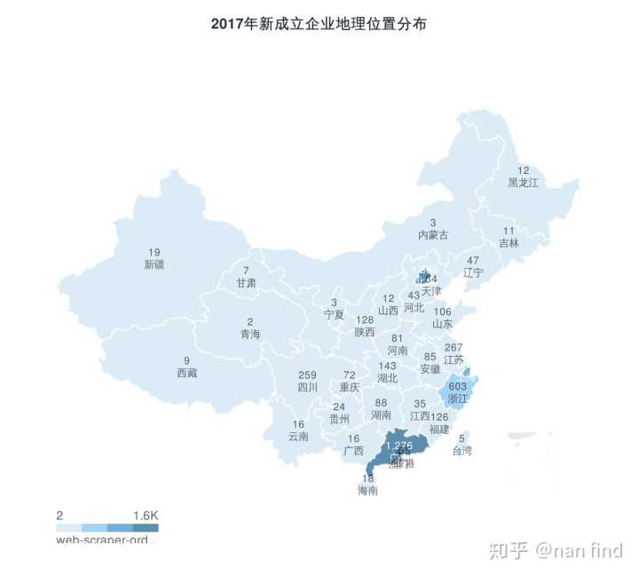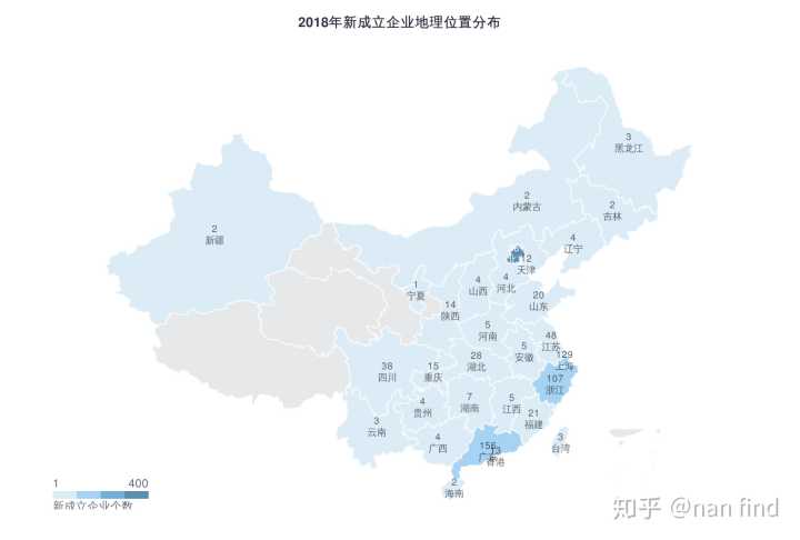 我们奉上2017年新成立企业地理位置以作对比,可以发现:在区域构成上,2017年同2018年差别不大,但是有一个突出差异:2018年广东人民创业热情遭受到了剧烈打击。在2017年广东人民创业热情不下于北京,2018年就只能与上海一较长短了。