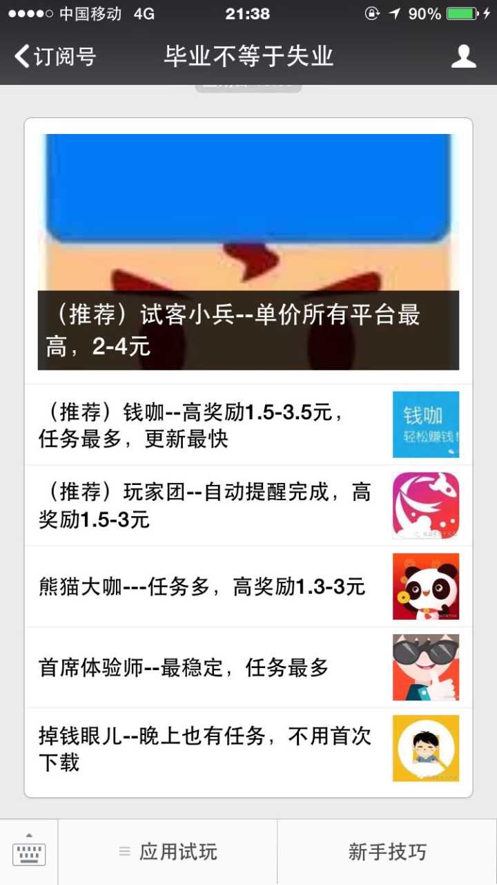 很多软件或者游戏公司为了增加知名度与下载量,会找用户进行下载试玩,以此提升APP商城里面的知名度。个人是比较推荐这种工作的,无聊的时候下载一下,一个软件几块钱,一天几十块钱也有。安全系数高,因为是软件公司为了推广而制定的工作,佣金是软件公司出的,并不存在交钱入会员的环节,存粹就是多劳多得而已。而且,这种工作玩的极致的人也有,我曾经认识一个人,大学生,6部苹果手机,都是二手的,他每天都沉迷于这种工作(大学有空),半年赚了近10万,赚的第一桶金后把手机全卖了,开始下一个创业项目,28岁已经是我们市6间店铺的老板,所以,这种工作都是靠量的,一个手机可以刷多个平台,一个人可以拥有多部手机,真正量变引起质变。对于想创业却没有启动资金的人来说,还是挺适合的。入行也很简单:关注公众号-点击平台-扫描二维码下载。行业壁垒很低。不过说实话,很累,很难坚持。过这种工作有两个缺点。1,需要一部苹果手机,安卓系统的也可以,就是佣金低很多。2,网上这种平台很多,需要仔细寻找。