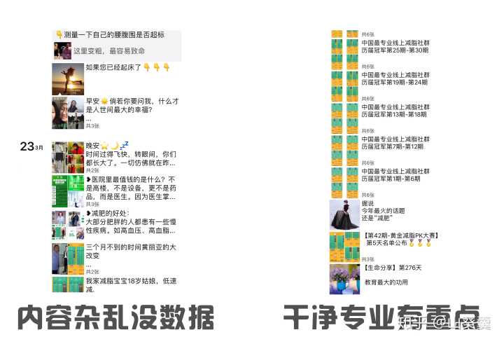 让你必须得去跟其中一个人去沟通,你会去选哪一个?当然是右边的人了!对这两个人都不了解的前提下,右边朋友圈日复一日的数据至少是真真实实摆在我眼前的,规划有序有毅力,让我觉得很专业。左边朋友圈呢?内容一天一个内容,没有重点,照片像盗别人的,我看一眼朋友圈也不能找出这个人的特质是什么。事实也是如此,A的动销每月3k,B动销每月3w。不仅仅是朋友圈内容,这只是一个很小很小的细节。在我接触这个群体越久越会觉得,微商这个群体想要做成人上人,是对自身要求非常高的。做的好的那些微商往往比他人更加注重自身形象的推崇,主动自身内容的输出;假如你的微信头像很模糊,沟通的过程中有一句没抓住用户痛点,线下陌拜ABC法则没有做好,可能就流失掉了这个流量;这都是再正常不过的现象。无论是微信头像、朋友圈打造、沟通技巧、线下陌拜等等都是你面向流量运输的内容;把这些所有的内容,他们的边边角角都磨到极致,才有引流的可能性。【记住了,因为客户买的不是你的产品,是你这个人。相信你,才会去买你的东西。】接下来,重点说下“人群”:我对接的经销商群体年龄大概在40岁左右,都是叔叔阿姨辈的人,接触久了真的会觉得他们其实蛮可爱的…说远了…他们最着急的问题就是流量。没有流量怎么办?去哪里找?有很多渠道跟方式,相信也是大部分微商在做的事;目前他们在做的有地推、发传单、线下陌拜、地区会议、线下沙龙等等…这些都有效果,但是效果如何?大家都知道,不会好到哪里去。他们最大的问题是:没有真正的利用到互联网的优势,一群打着做互联网口号的人却没有真正去做互联网的事,用最费时最不讨好的人力去吸引流量。假如你要售卖的产品是一款减脂产品,你想一下,除开这些费事费力的引流渠道你还会想到哪些?