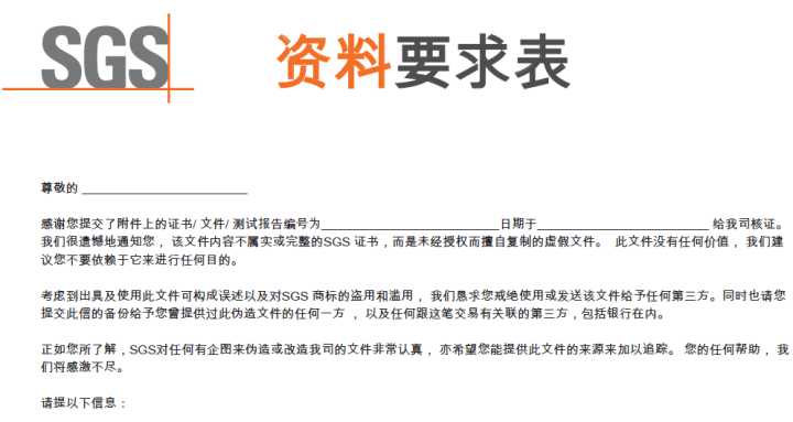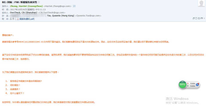 “谢谢您提交参考号HKHC1612008533HC-01文件用于真伪鉴定。我们抱歉地通知您这不是SGS的原始文件。因此,这份文件无论如何没有价值,我们建议您不要依赖它来做为任何用途。”