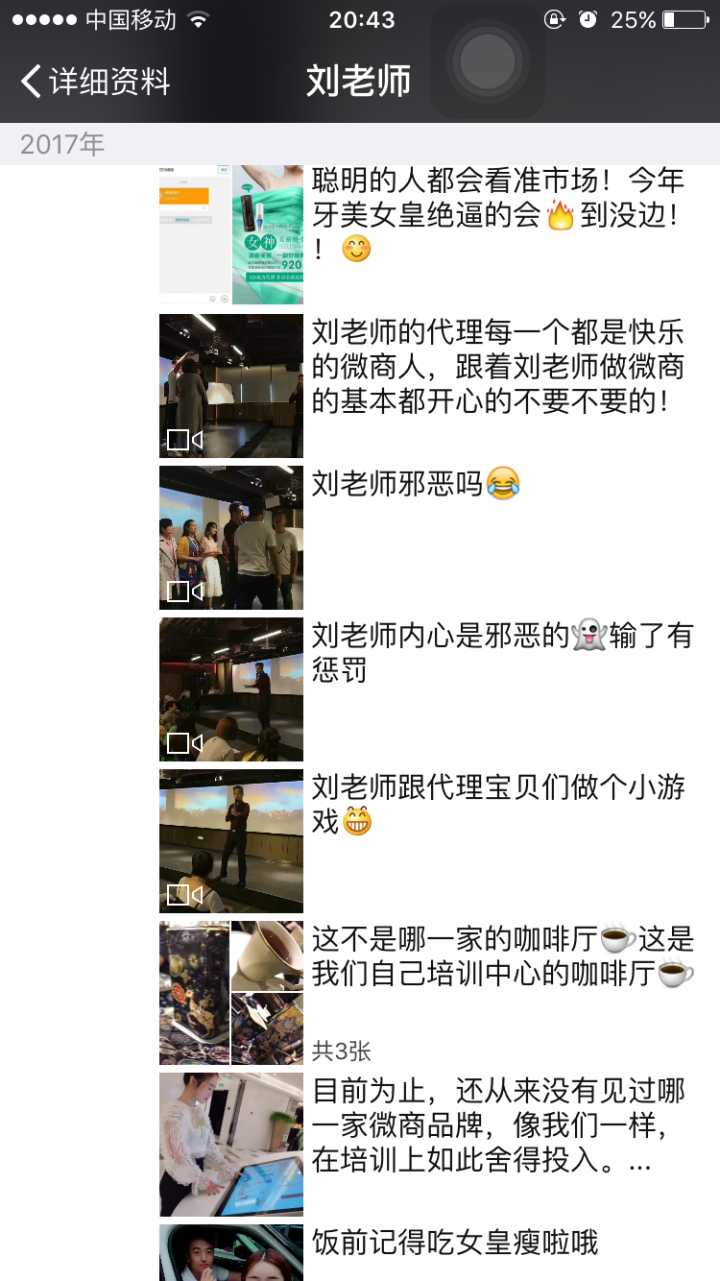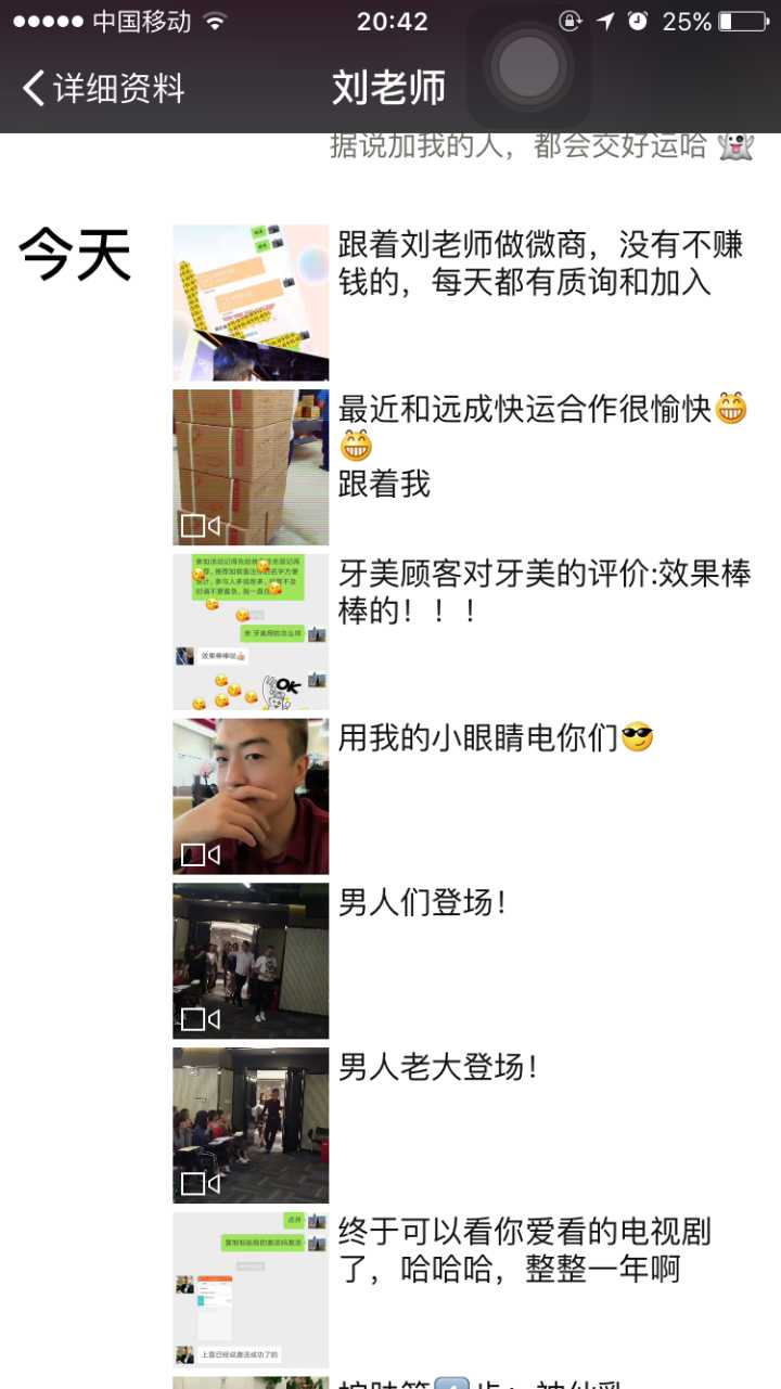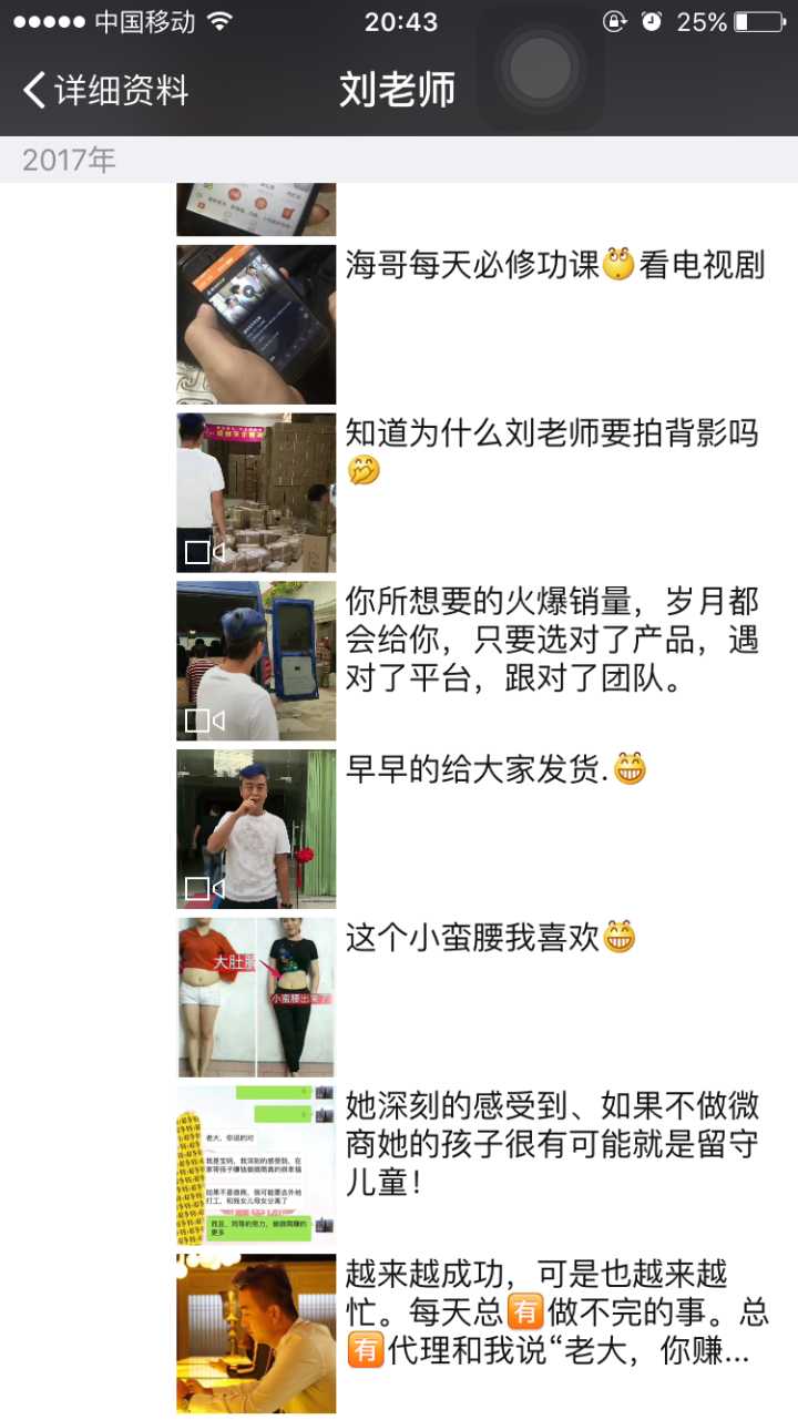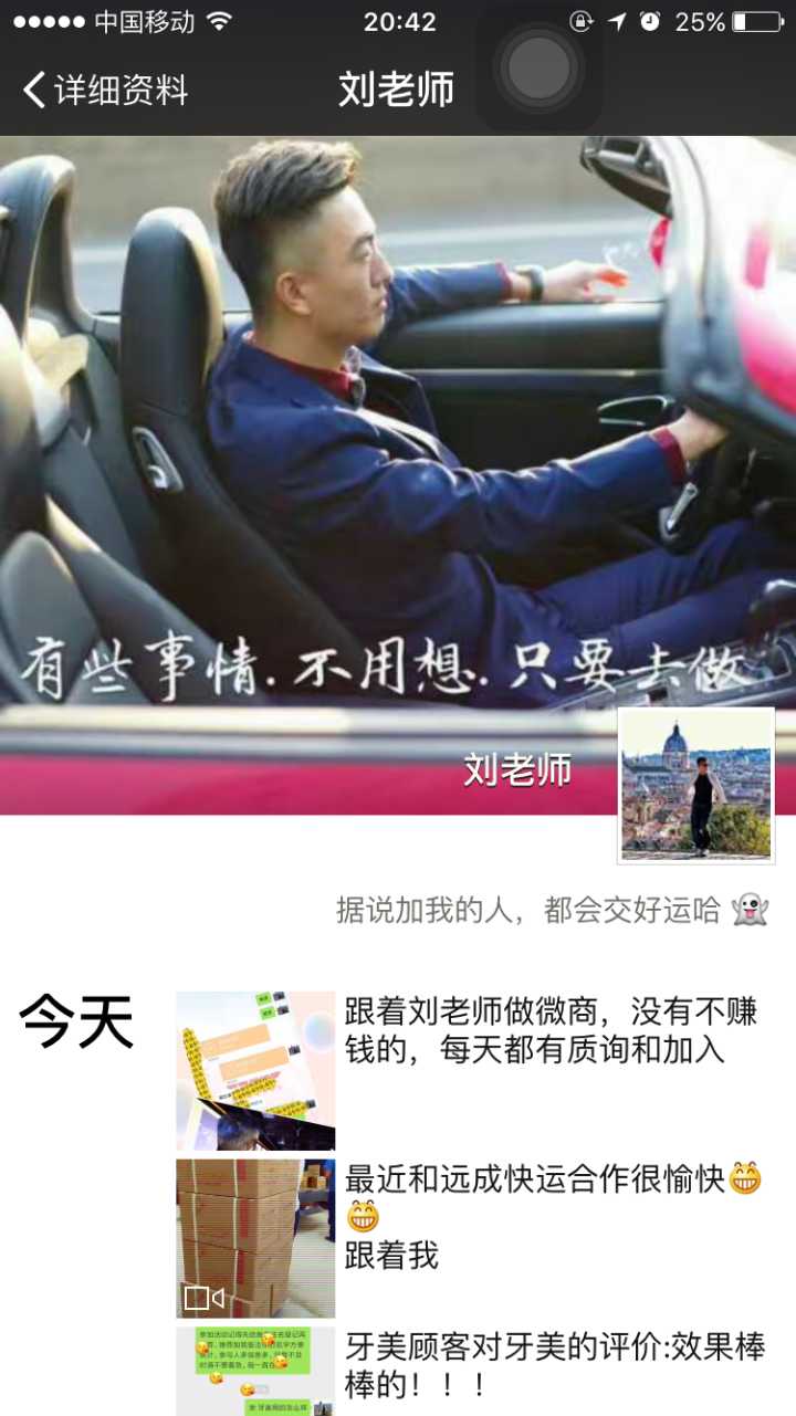 这个人微信叫刘老师,每天马不停蹄的卖一代女皇(益生菌减肥糖)和牙美(洁牙慕斯),每天都是几车几车的进货,关键是还不是照片,是视频,每个视频里都有自己,而且有豪车有别墅。最重要的直播了一场自己的土豪婚礼!!不过他晒的照片就很糊看起来像保存了好多道的那种,问题是感觉应该的确是个有钱人!很好奇他是怎么装下去这个逼的!!