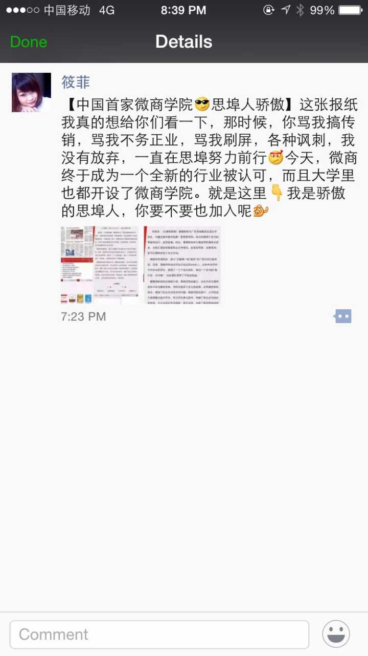 随便几张感受下 我觉得2014年是微商最多的时候不管是QQ空间还是朋友圈各种所谓的产品大把大把秀秀利润秀效果秀自己赚钱的优越感2014大一上学期去买衣服都被老板娘忽悠的开始发小广告她说你做我代理吧我们城市哪个大学的学生做的怎么好怎么好我相信你也可以这么大了也该经济独立了*罒▽罒*我多买几次衣服就从了想想也是傻你发几个图就有钱了?世界上就没有穷人了 呵呵哒我发了 而且发了一个月我爸不止一次问我你发这个有什么意义还早中晚三次你当吃饭啊我说没关系会有意义的 我脑子肯定被驴啃了后来我自己都看不下去了就删了关于神皂的所有顿时觉得神清气爽啊 朋友圈都干净了可是我一个朋友在之后不久真的入了坑﹋o﹋她是一个特别懒的女孩子考试也不担心每天就窝床上吃吃睡睡看看小说有一天她突然和我说她要入行微商了真的是太可怕了她先是交了350做起了一级小代理记得她先卖的是睫毛增长液她真的特别实在什么产品都要自己开始用而且她心理作用特别强大她睫毛本来就长 每天涂一点点后来还是那个长度 她说这都是我产品的功劳你要不要试试毕竟我睫毛短( •̀∀•́ )这实在的姑娘让我先试用我每次都担心用了之后睫毛掉光了怎么办 后来她放弃安利我了~( ̄▽ ̄~)~我还是安安静静做个短睫毛的少女之后她觉得销量并不好就转战面膜!没错就是这东西她先是加入一个团队后来刷刷刷好友数量从30内升为800+?真的是特别恐怖!从此她的朋友圈再无净土之后这姑娘每天都开始爬楼每天在团队里听课还专门拿出本子记笔记她是多么懒的一个女孩子啊单词都舍不得花时间背专门在晚上记 每天记 关灯了开台灯记后来她的性情发生了变化不管去哪儿她都会打开附近的人疯狂的加加加问她为什么 多一个好友多一笔生意后来期末了她和我说她要升级了升级才会有更大的利润(●´∇`●)我的表情是这样的她又付了近2500变成了二级代理 还有了授权证书这个时候起 她可以招小代理了我们这个学校女生多 但几乎没有女生买相反的有一天晚上快门禁了她匆匆跑下楼回来问她怎么了 她说有个男生跟自己聊了之后买了5片(⊙o⊙)欧凑!这世界后来她朋友圈的封面变成了自己的授权证书后来她的微信头像变成了自己照片+代理品牌后来她每天一闲下来就开始发广告后来她有时间就开始修图ヽ( ຶ▮ ຶ)ノ!!!我真的觉得太可怕了她和我说她一打开朋友圈从吃的到穿的到用的什么都有她都忍不住要买了我觉得更可怕的是她高三的班级一个班级全部都做起微商!这是何等的卧槽!还在班级里定职务~总经理,销售部,售后服务部……然后就是暑假了……开学刚见面她说我又做了其他代理xx红糖 可以治疗经期痛经 美白养颜 巴拉巴拉因为她很实在又心理作用强大喝了之后就觉得整个人都棒棒哒她安利我 安利整个寝室……就感觉这红糖挺硬 嚼嚼还不错(๑‾ ꇴ ‾๑)一小块6元差不多 而且是论罐卖……她现在已经在床下放了一大箱未售出的面膜还有瓶瓶罐罐的红糖哦还有爽肤水 祛疤膏她一直很相信她的品牌可能觉得每样东西的售价比较高我挽救很多次都失败了毕竟她曾赚了4000 她觉得还是挺有前途的而且她高中同学都会向她买啊(ᵒ̴̶̷̤́◞౪◟ ᵒ̴̶̷̤̀ )去年和她出去玩 缆车上自拍玩得好好的突然拿出一片面膜开始各角度拍几秒后 朋友圈多了好几条……而且每样东西都能和她产品扯到一起我真的 震惊到 说不出话来ヾ(༎ຶД༎ຶ)ノ”这只是其中一位啊啊啊啊啊