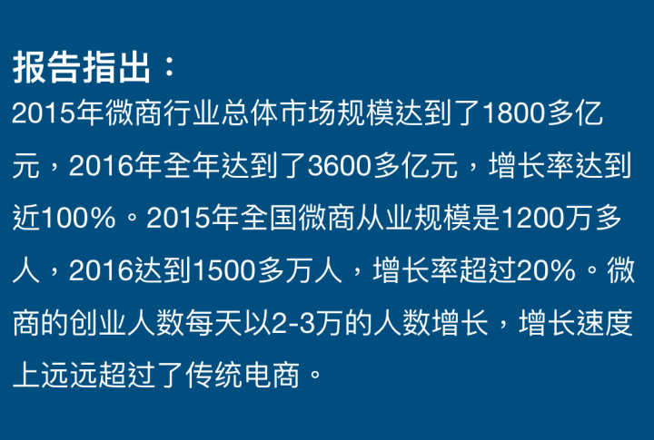 今年3月份,中国互联网协会微商工作组在CCTV上对外正式发布全文版《2017中国微商行业发展报告》。