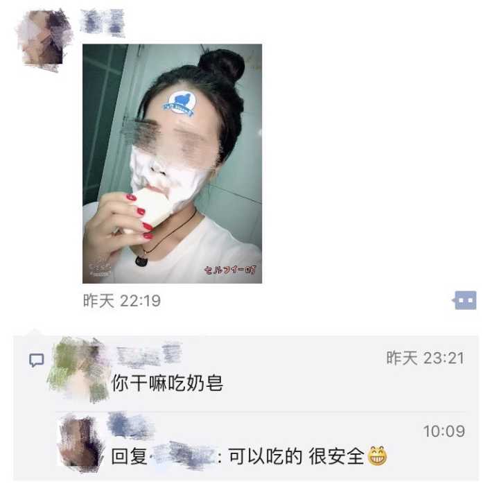 除了夸大产品的功效,很多微商营销产品的方式也让人惊讶。网友Kimi说,她身边就有这么一位卖肥皂的微商朋友。除了发布用肥皂洗脸的视频,她宝宝用肥皂洗脸的照片以外。最近,她还尝试了一种新的拍照方法,就是——吃!肥!皂!