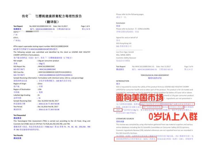 大量的微商产品夸大功效,就像上篇文章提及的传奇X生红樱桃唇膏,它发布的SGS第三方配方毒理性检测报告,提及到“是0岁宝宝都能使用的唇膏,不含香精,符合化妆品法规,眼周也可以使用,值得高度推荐,使用食品级成分。”等针对消费者痛点的字眼,让我不禁怀疑它的真实性。