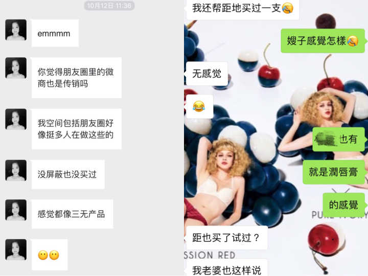 他们的朋友圈早就被微商刷屏。除了卖唇膏以外,还有卖肥皂的,保健品的,面膜的,牙贴的,化妆品的,等等。不少网友表示,出于对朋友的信任,已经买过其中好些产品。虽然觉得广告内容离奇古怪,但都没有多想,总觉得传销应该是在山里吃土豆的训练方法,不会是以这种自由的方式。