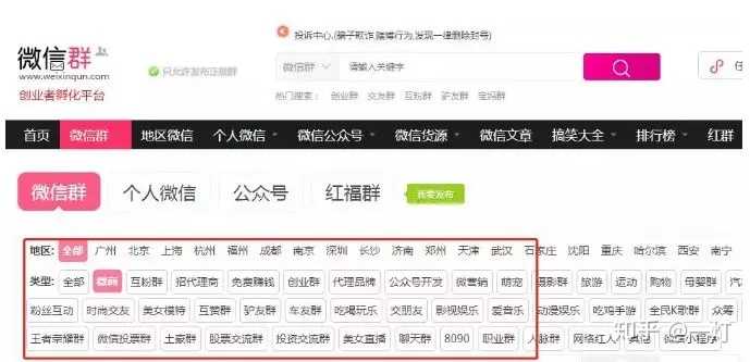 比如说这个网站,点击打开之后会看到有很多分类的微信群,如下图。