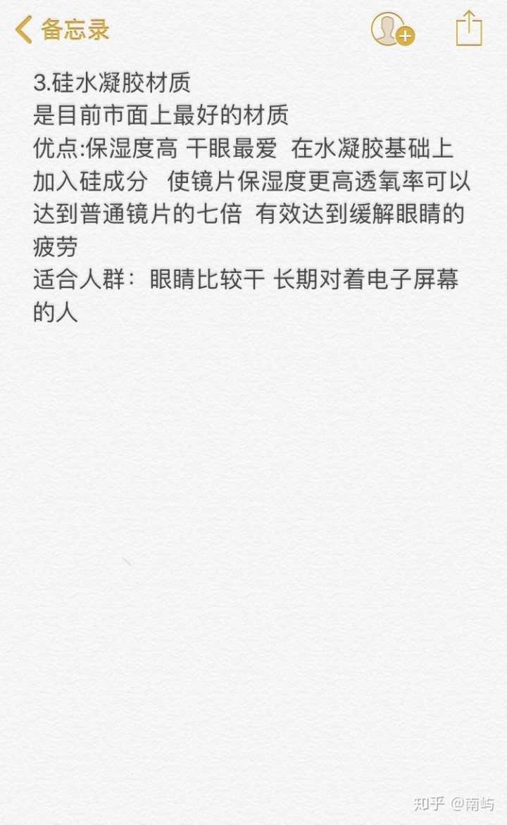 我觉得买美瞳这种要放在自己眼睛里的东西,一定要提前了解一下大概的材质,也是让自己用的安心一些。在这里我就简单的说一下,自己了解到的信息:1.HEMA普通材质,也就是以前最常见的美瞳材质。适合眼睛健康的大部分人,但是要注意佩戴时间,最好不要超过4个小时。平时使用的时候也要注意卫生。如果要熬夜或搭乘长途飞机之类的,也不要使用,眼睛会感到干涩。2.非离子材质镜片,这种材质具有较好的湿润度,而且不易聚集蛋白质沉淀,也就是自己眼睛分泌出来的东西不容易导致这种镜片的模糊。3.硅水凝胶,可以说在现在很常见了,适合眼睛容易干涩的人佩戴。