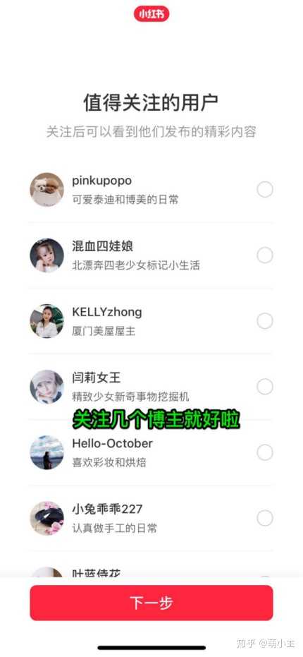 第四步:点击几个你关注的博主,3-4个就好,然后点击下一步: