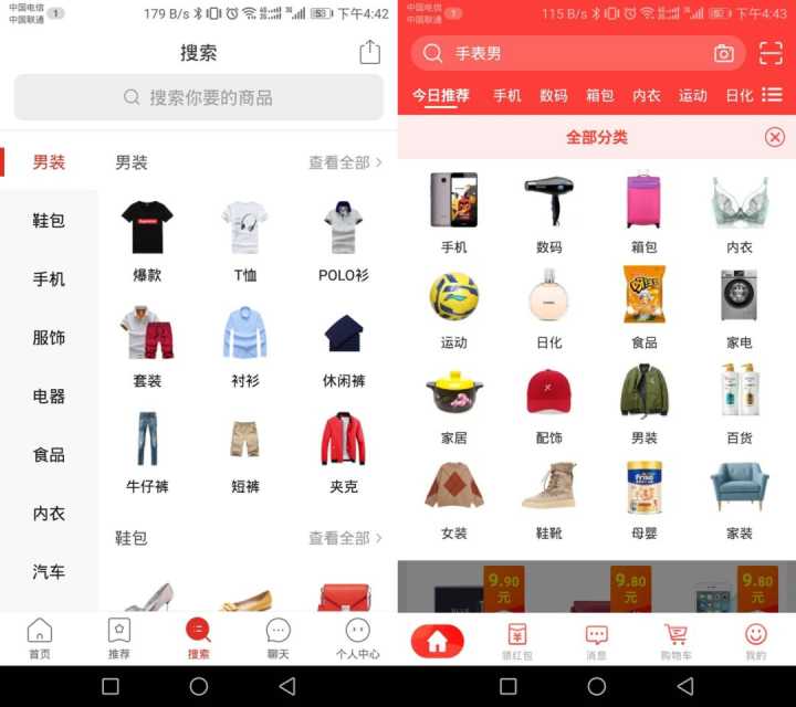 相比而言,拼多多在分类页的呈现上更为精细,以男装为例,拼多多的分类页上,可以直接看到,T恤,POLO衫,牛仔裤,短裤等二级类目,用户可以更精准的达到自己需要的商品,而这一点,淘宝特价版就稍差一些。
