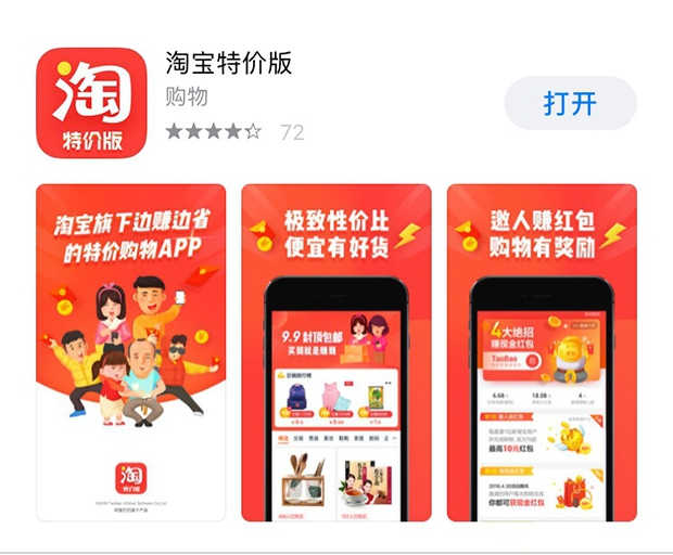 拼多多借助微信的流量玩拼团裂变,而淘宝“特价版”中采用了分享抽佣金的方式来获取用户,每邀请一个淘宝的新用户,就能够获得红包,但新用户的抽佣少且限时,这在传播力度上显得有些弱势。