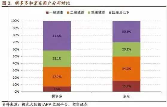 可以看到,以电商平台为例,不同特色的电商,依靠各自的品牌调性及价值优势,牢牢把控着各自的目标受众,这也是“消费分级”的体现。京东的根据地是一二线城市,拼多多则依靠三四线城市,成为新的黑马。