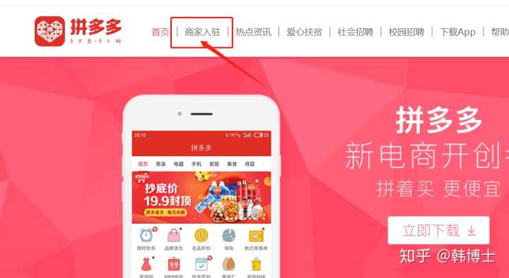 2.在拼多多主页中的上方找到商家入驻。