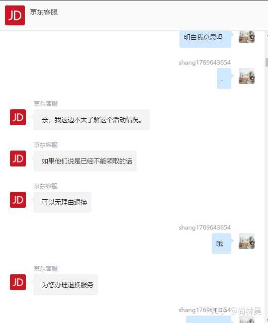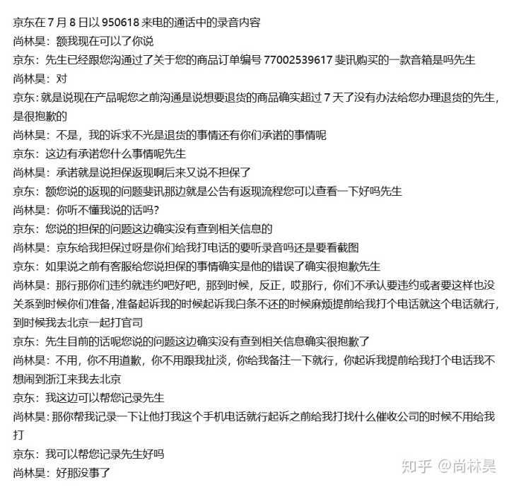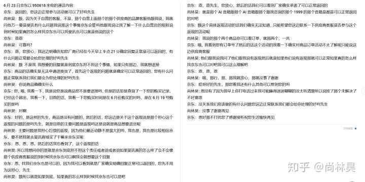 后来他们6月23号以950618给我来电,我问他们的时候是不是活动找京东也可以,如果不是我就退了,通话内容详见图片,这是通话内容翻译出来的文本形式的: