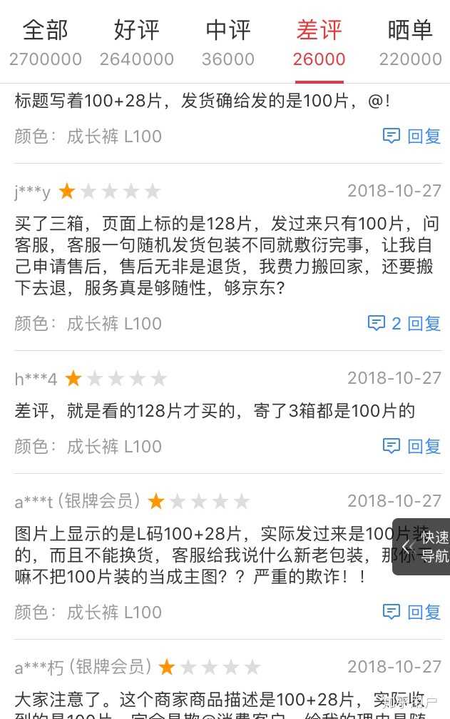 比如这款商品,从首页的五张图片,到标题,到内容详情,到售后规格全是128片每箱,然而实际上很多人收到的是100片每箱,官方解释为100片为老包装。