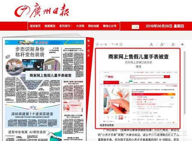 14. 今天被一些强有力的技术手段全网封杀的一则消息:《广州日报》关于京东手表再三作假,警方端掉做假窝点的页面版块,已经点击不开。
