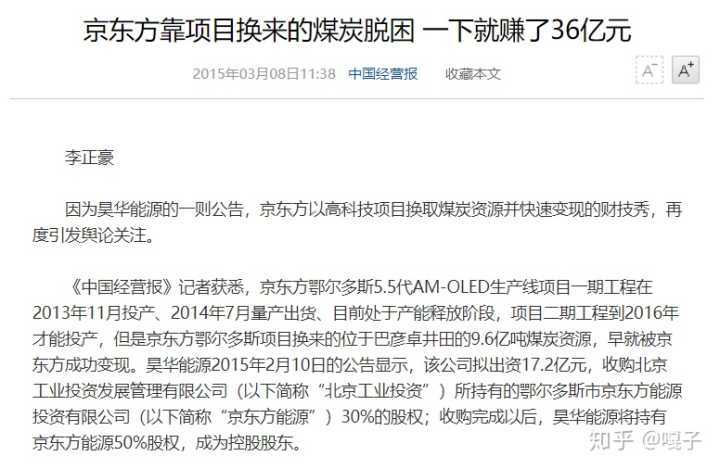 还有一件,就是之前说国家补贴的事:鄂尔多斯为了吸引京东方,直接送了京东方一个煤矿。各人感觉煤矿也是好赚钱的,风险小,但京东方直接转手卖掉,继续搞自己的液晶显示器。应该是花钱去搞技术去了吧。