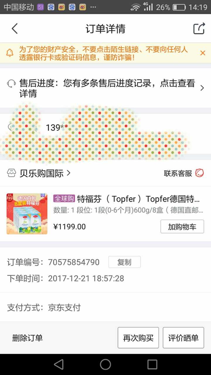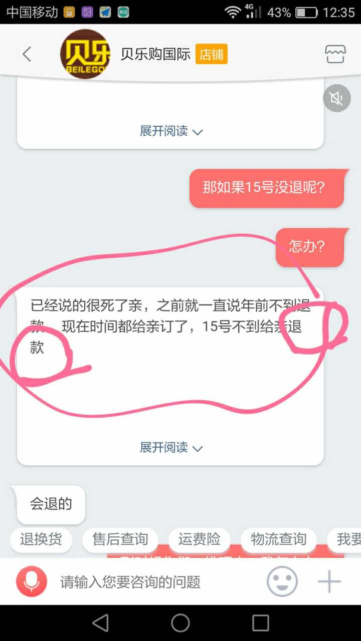 月21买的奶粉,现在2.10号,没有收到了,之前一直投诉反馈,京东介入,说年前收不到货给退款,我今天知道他们明天就放假了,必须让他们今天给退款,不然过年我找谁去。结果他们说15号收不到在退款。然后最后又翻篇,说15号给退货处理,等啥时候快递找到货退给他们,他们在退款给我。而且京东在我没收到货的情况下一个月自动确认收货了。显示订单完成。