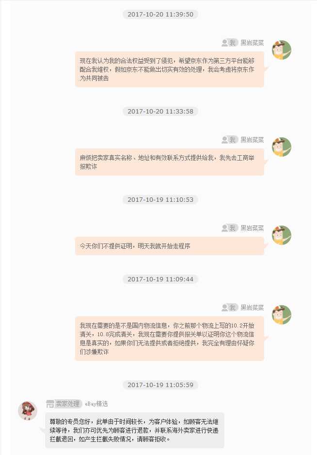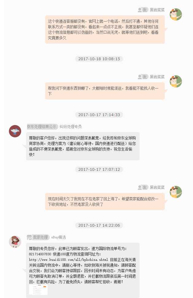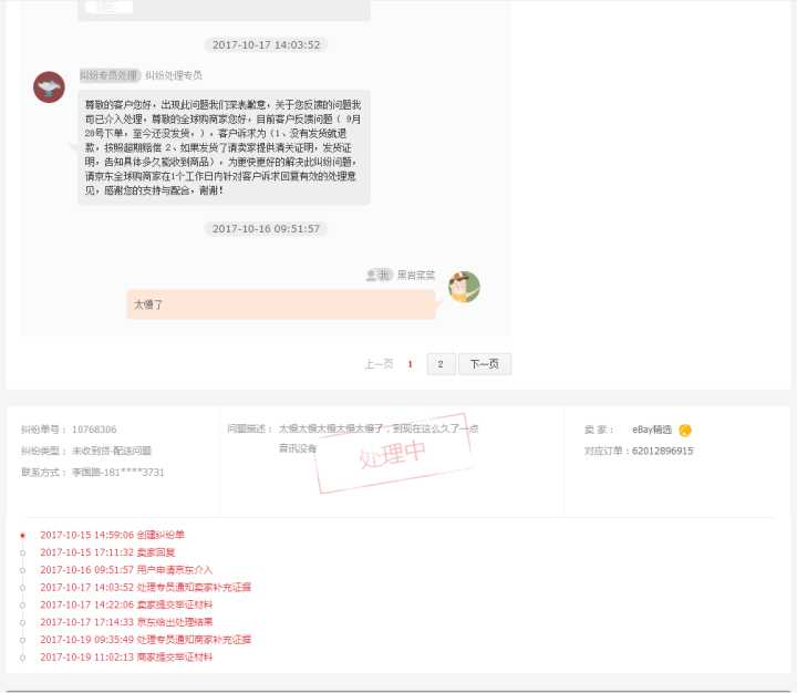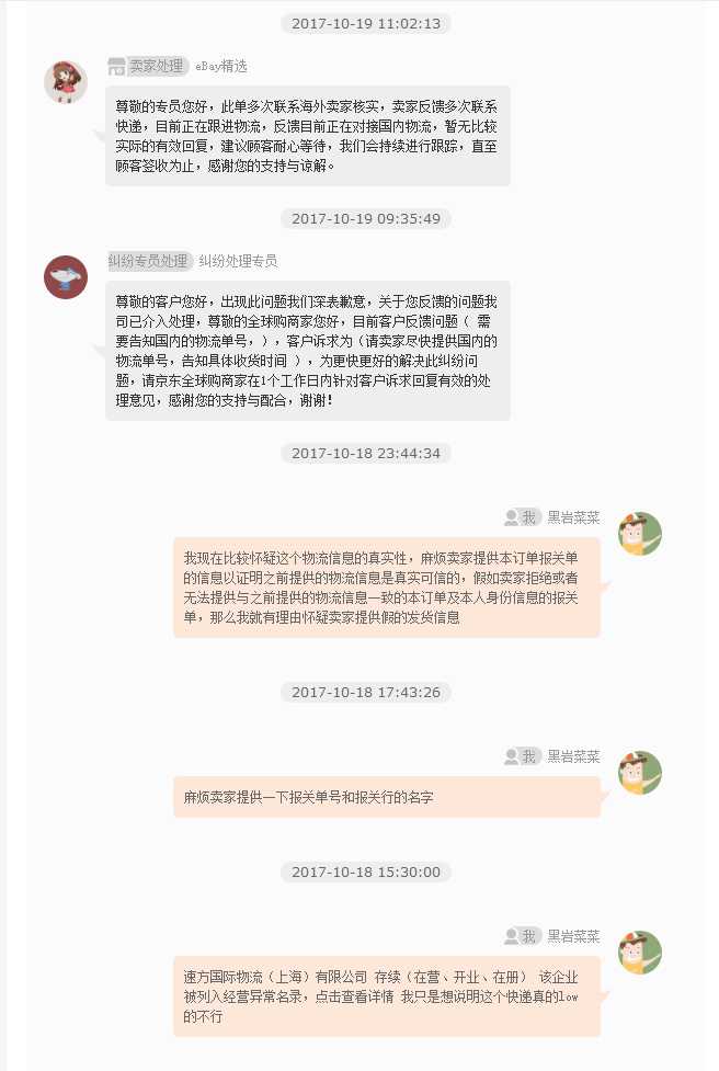 然后直到10.13一直未发货,反馈后店家客服说正在报关,京东客服建议我申请纠纷,我又耐心的等了两天,于10.15号申请了交易纠纷,商家于10.17根据京东要求填写了发货单号