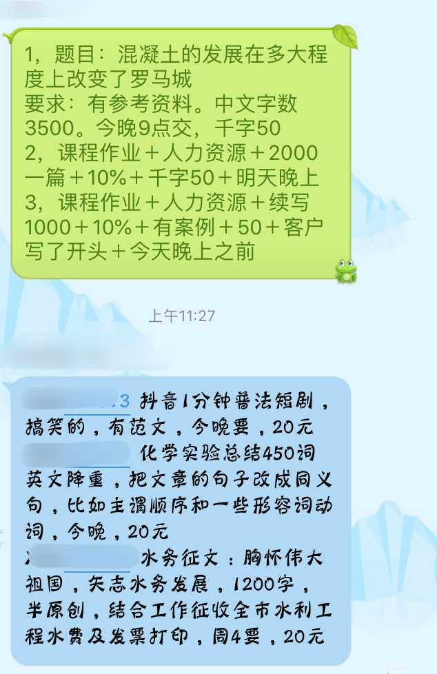 群里的要求都特简单,有专业的也有非专业的,日常什么情书演讲稿征文诗歌童谣之类的,这些简单,所以钱也相对低,千字30的标准吧。但是456月份是论文旺季,专业论文啊,帮助酱虫啊,或者论文修改之类的,佣金都会比较高,一般一篇文科论文几百,英文的翻一倍,理科更高。