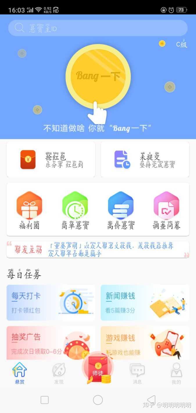 这个软件叫众人帮,不知你有没有了解过,做任务,拿赏金,我做了十多天吧,一天两三个小时,几十块钱,够吃饭了