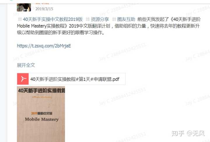 社群里面有各种最新的资料,包括《40天新手进阶Mobile Mastery实操教程》2019版的,这种国外大牛的力作,是很多新手甚至就算做了很久的affiliater 都值得借鉴的。