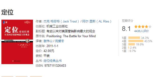 《定位》本书提出了被称为“有史以来对美国营销影响最大的观念”——定位,改观了人类“满足需求”的旧有营销认识,开创了“胜出竞争”的营销之道。(这是我读过最差的一本书,部分内容译得很生硬、甚至前后矛盾,读起来让人皱眉头,最后几章个人定位的部分值得推荐)