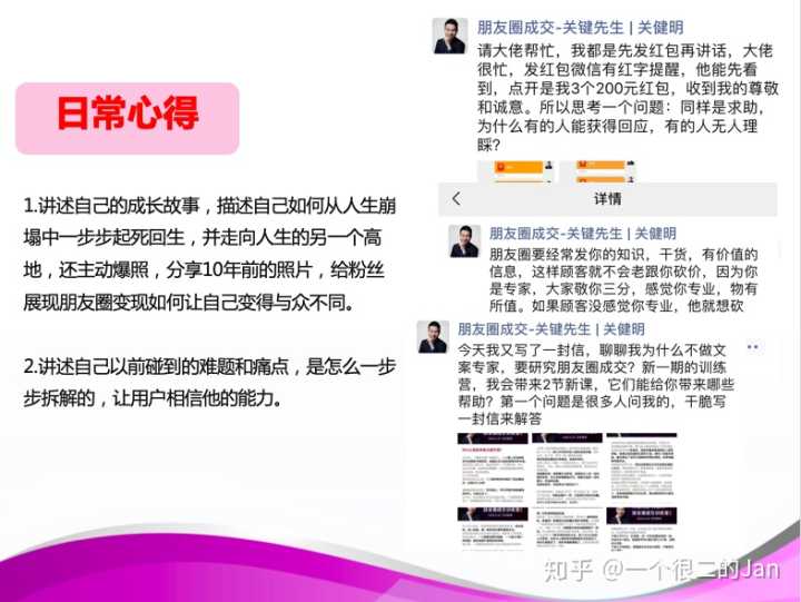 1.讲述自己的成长故事,描述自己如何从人生崩塌中一步步起死回生,并走向人生的另一个高地,还主动爆照,分享10年前的照片,给粉丝展现朋友圈变现如何让自己变得与众不同。
