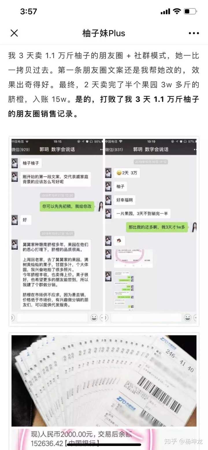 郭玥是美女讲师,她想帮舅舅卖赣州脐橙,请教我怎么做社群发售,从文案,到话术,都一比一拷贝我的。最后,她 2 天卖完了半个果园 3w 多斤的脐橙,入账 15 万。打败了我 3 天卖 1.1 万斤柚子的记录。
