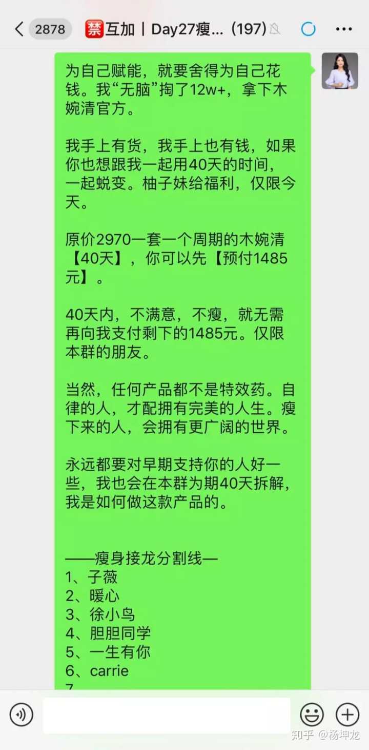 我切入减肥产品,我会在朋友圈做铺垫的。第一条朋友圈铺垫,跟大家做一个打赌,然后寻找第一批意向客户。通常第一批意向客户都比较难找,但是难找不代表找不到。你要记住,方法比困难多。