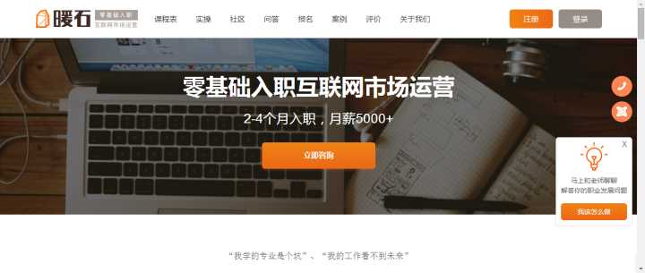 4,暖石100—-致力于帮助互联网小白或是转行人员从零开始学习互联网市场营销。课程专业知识的讲解和实操练习作业,帮助新人迅速掌握市场营销专业相关能力。