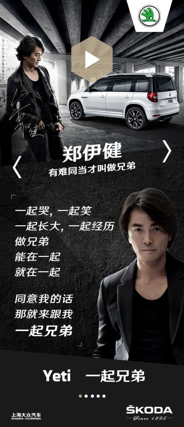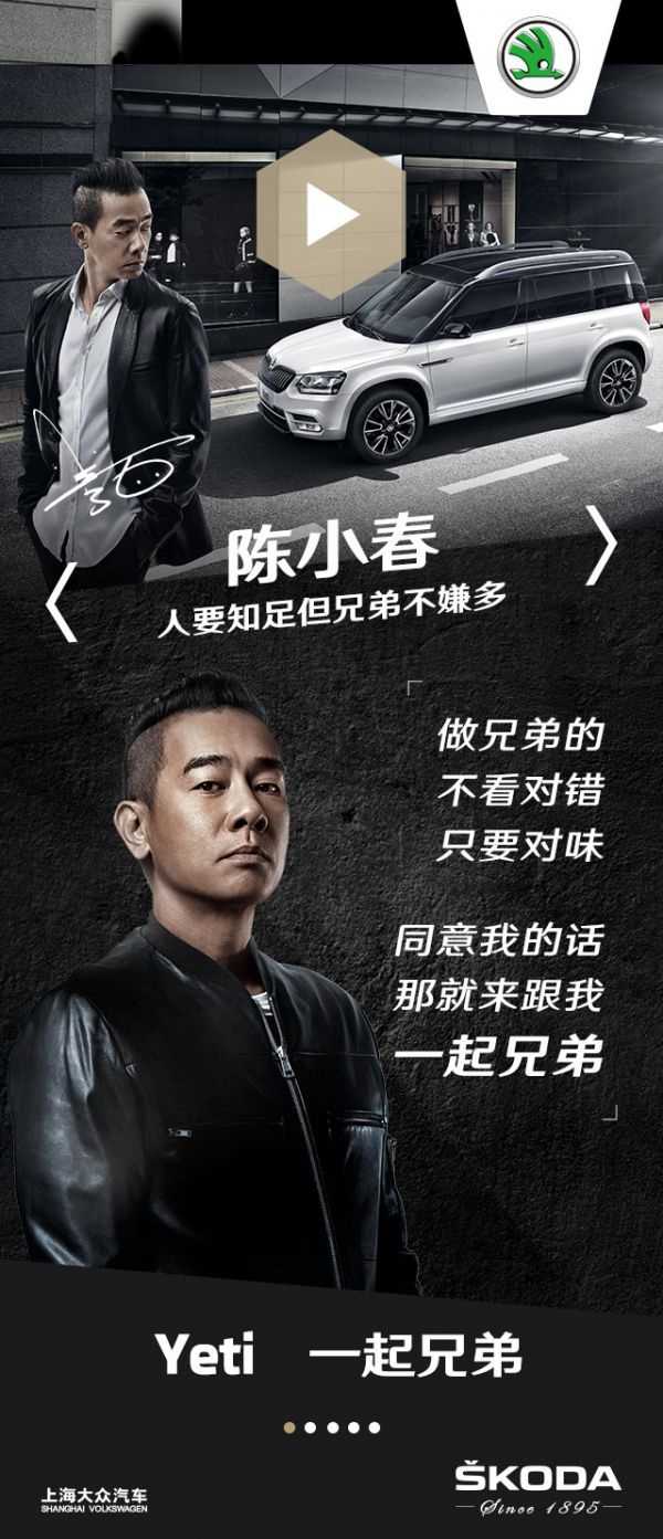 但是这几年斯柯达的营销做的真的很好,尤其是斯柯达YETI的“一起兄弟”的营销(注意,是“一起兄弟”,不是“一起古惑仔”),全程参与到郑伊健、陈小春、谢天华、钱嘉乐、林晓峰五兄弟(为了打字方便,简称为古惑仔兄弟。虽然对于“古惑仔”这个抹不去的标签,五兄弟都不愿提起。)重聚这一事件中。