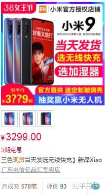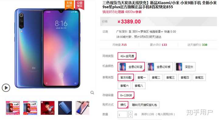 这是我在天猫上搜到的小米9现货,产品相较官方发布的2999元,加价将近400元,但是注意看销量,该店面已经发售了715台了,并且看库存,大概还有200+台小米9。