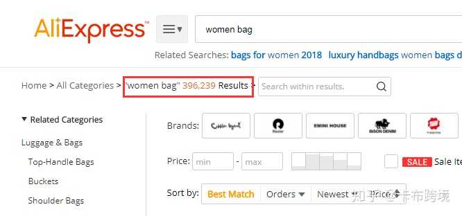 我们再来对比一下速卖通,在速卖通平台上搜索女包这个词,只有39万的搜索结果,
